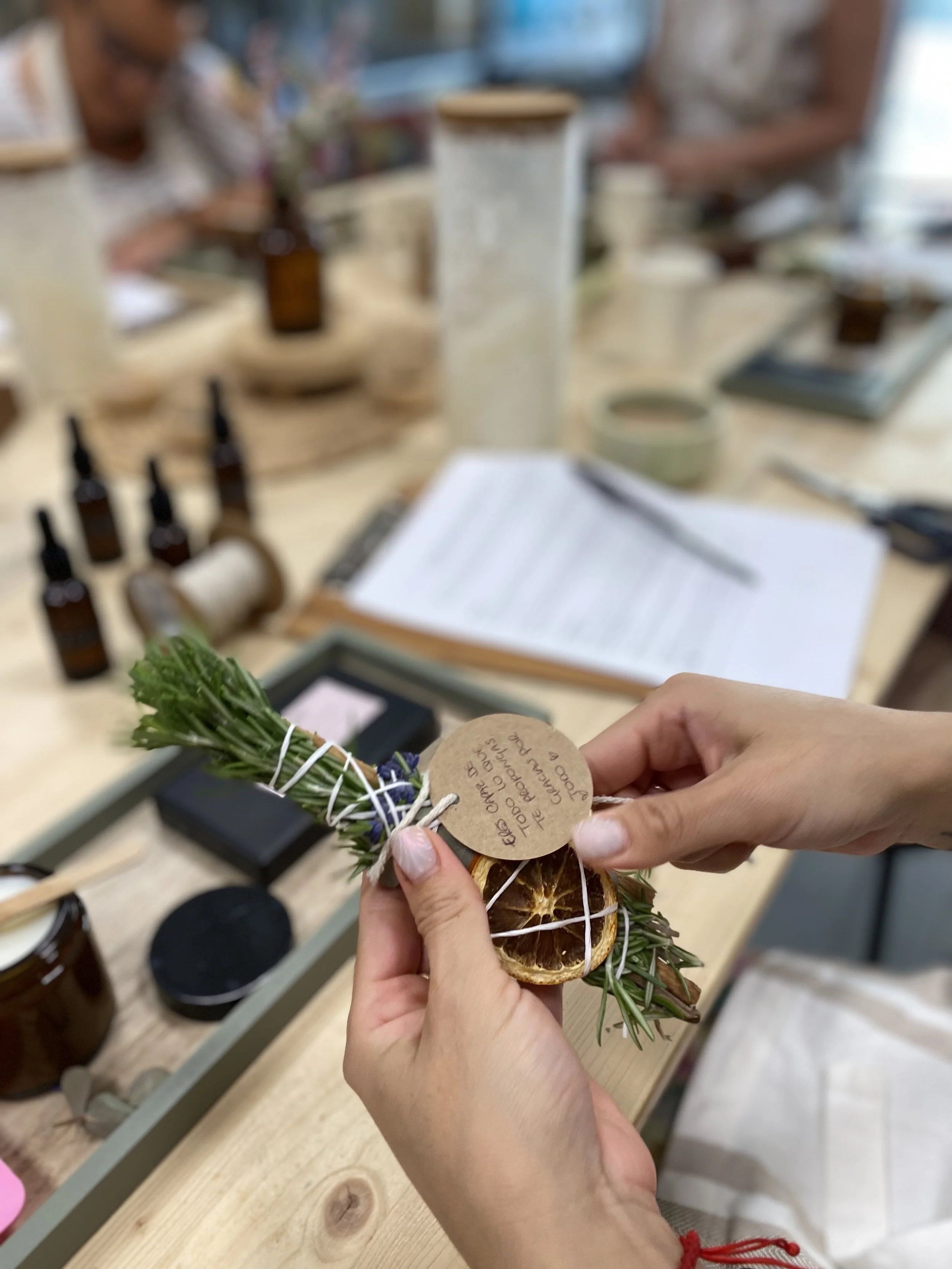 Durante el taller, aprenderás a crear tu propio sahumo artesanal con plantas naturales como romero, rosas, ruda y otras hierbas, entendiendo el significado energético de cada elemento y su uso para limpiar espacios, aura y energía personal.